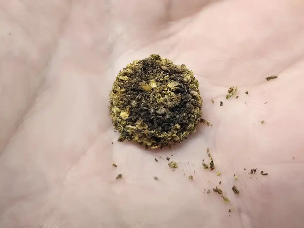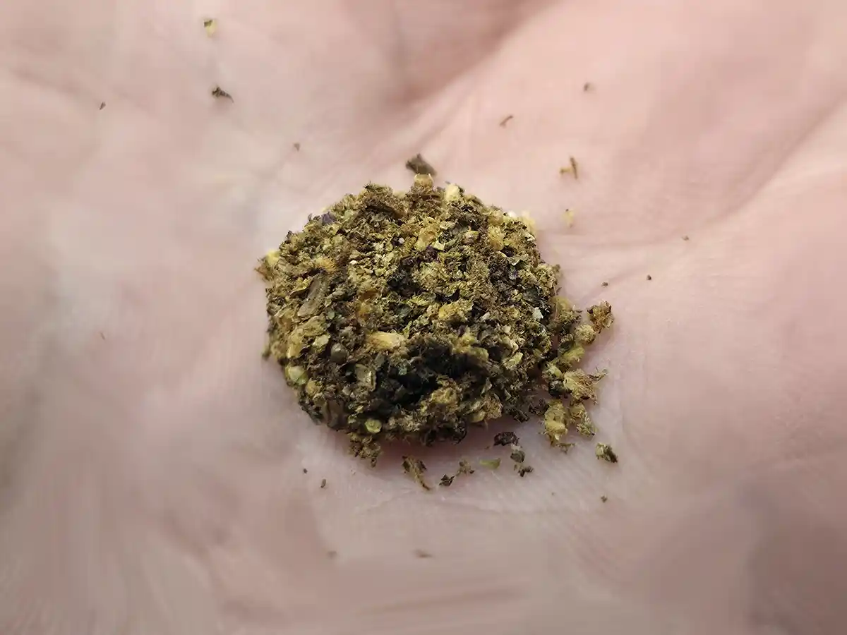 A single hit leaves the herb roasted and discolored. The uneven colors are from the dark bottom ring.