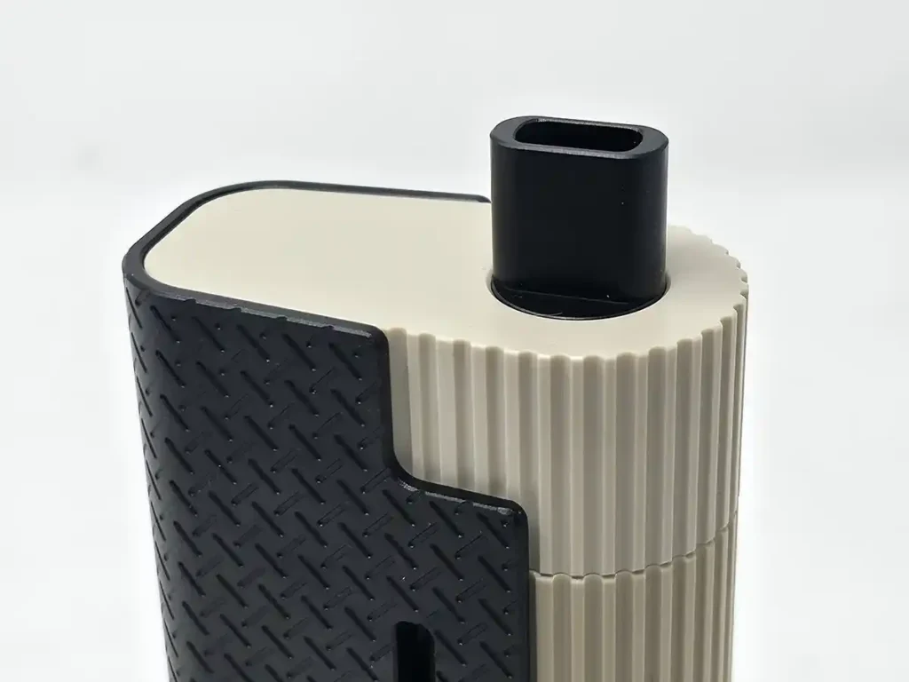 The Frolic feels great! The beige parts are made of PEEK plastic, and the black parts are also made of PEEK, but they look and feel like metal. The vape feels heavy in the hand and is solid. It could be used as a blunt-force-trauma murder weapon for sure!